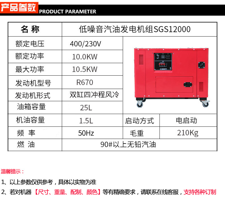 可跟客戶需求定製5KW-20KW低(dī)噪音汽油(yóu)發電機。